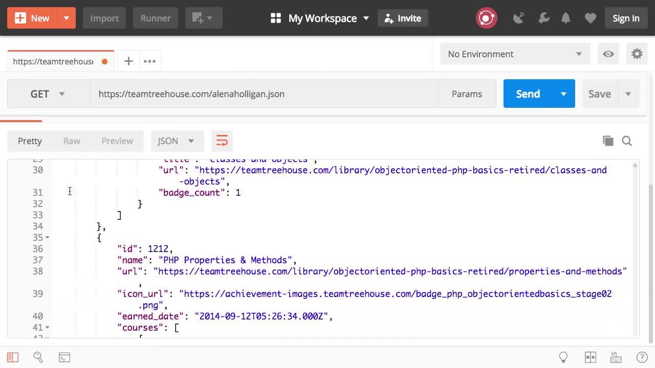 NOTE: the URL endpoint for treehouse profiles has changed slightly. Be sure to use https://teamtreehouse.com/profiles/alenaholligan.json instead.